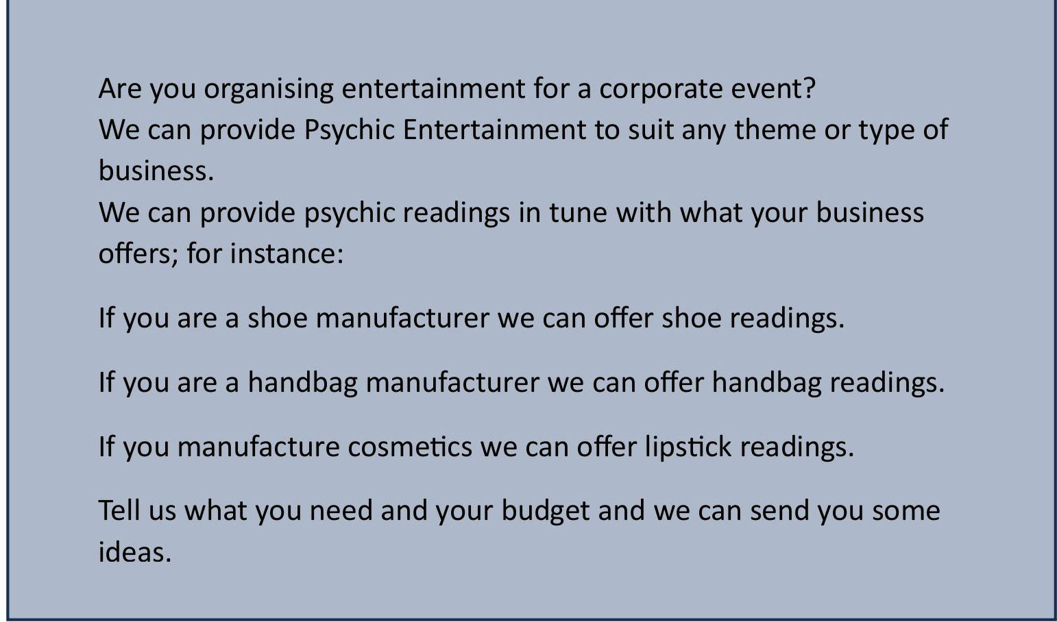 Brenda says that it is possible to give a psychic reading from anything; objects, artwork, items of clothing, even parts of the body. She says that combining the emphatic and the humorous makes for an amazing fun filled event; while still honouring the seriousness and sensitivity of her mediumship and psychic ability.
