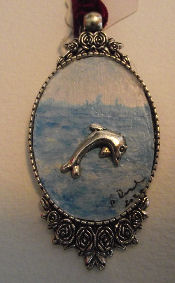 | 'Leaping Dolphin' 30 x 40mm Hand painted acrylic background with silver tone charm depicting a dolphin. Comes with velvet ribbon ready for hanging as a work of art, or you can add a chain and wear it as a unique 'one of a kind' pendant. £17.50 inc uk p&p&p. Option: dolphinpen1 |