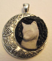 | 'Spirit Cat' Beautiful pendant with various spiritual symbols. Inset with a ' one of a kind' 25mm handmade and painted clay picture of a cat silhouette. Signed on back. £17.00 inc UK P&P. Option: spiritcat1 |