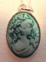 | Pretty little clay cameo set in an 18 x 25 mm frame. Handmade and painted by Brenda@Spooktacula. £7.50 inc UK p&p. Option: smgreencam1 |
