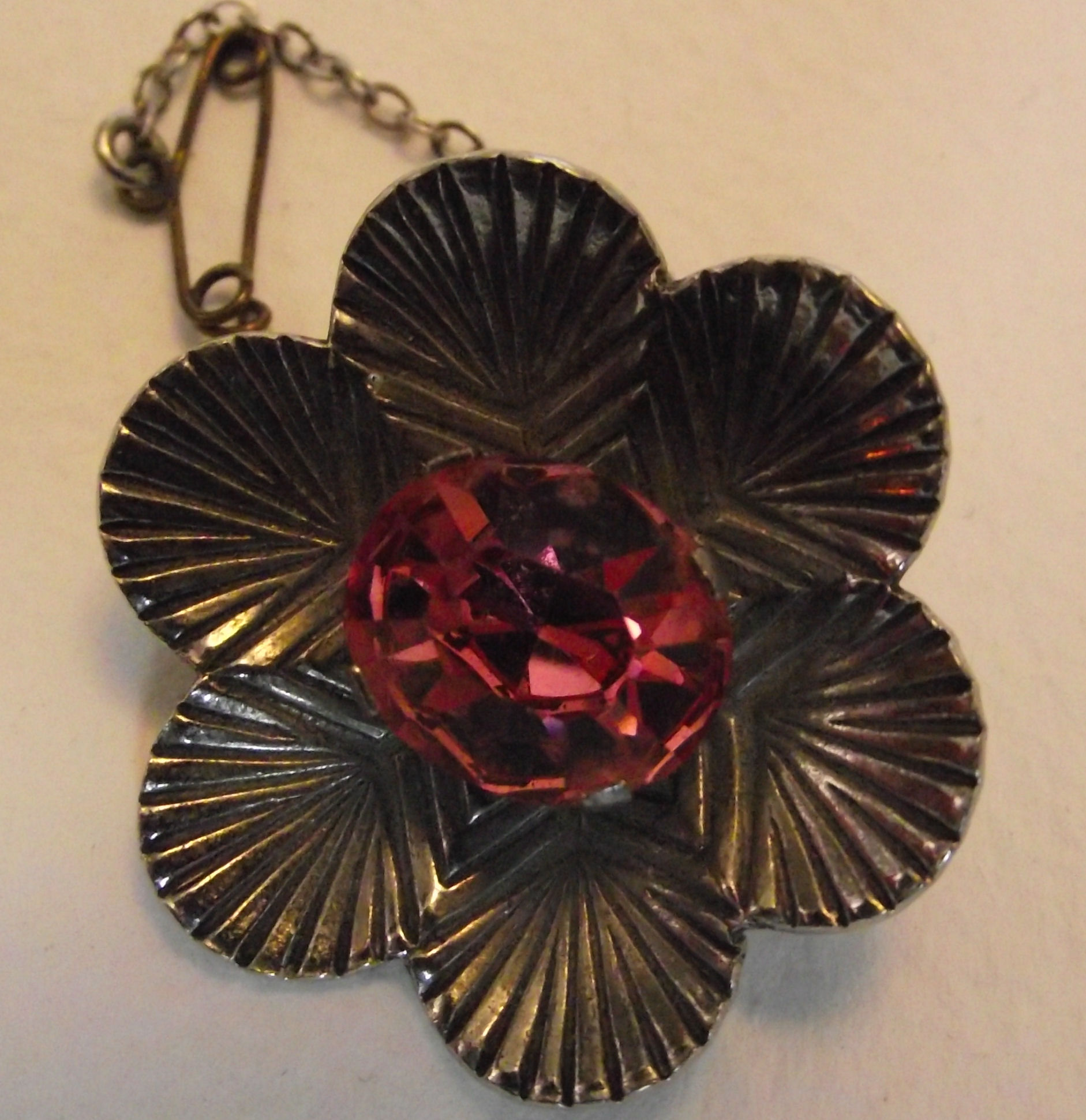 | Pretty vintage 30mm silvertone flower brooch with pink glass stone and safety chain. In very good vintage condition. £5.99 inc UK p&p. Option vpinkflower |