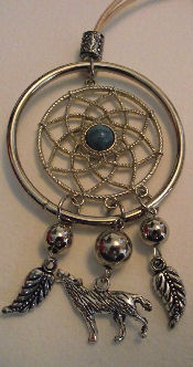 | Dreamcatcher pendant 2inches across. Turquoise colour stone, two feahers and a wolf hanging from bottom. Comes with beige colour thonging, ready to wear or hang. £7.50 inc UK p&p. Option: dreamcatchpen1 |