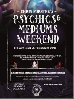 3 nights bed and breakfast including 3 evenings of stage demonstraions of clairvoyance, mediumship and mentalism £100 Osbourne House Hotel 8-10 Reads Avenue Blackpool FY1 4BP Tickets from the hotel Telephone: 01253 622104 or contact Chris at www.psychicevents.co.uk