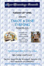 Tarot and Dine Evening at The Bolthole Cafe' TICKETS £15 Includes a 15-20 minute psychic reading and a meal for every ticket holder Tickets obtainable from the venue BOLTHOLE CRAFT CAFÉ The Hut, Dovecliffe Rd, Wombwell, Barnsley S73 8UE Telephone: 01226805955 |