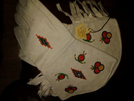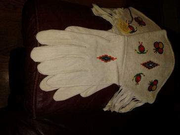 Vintage unworn Kootenai (Canadian Indian) machine stitched buckskin/kidskin gauntlets . These have lined cuffs and unlined hands and are a creamy/off white colour. SOLD